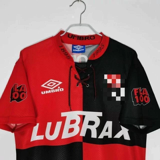 Essa é a camisa retrô do Flamengo do ano de 1995, modelo conhecido como Papagaio-Vintém, foi lançada no ano do seu centenário, esse modelo possui as cores predominantemente Vermelho e Preto.