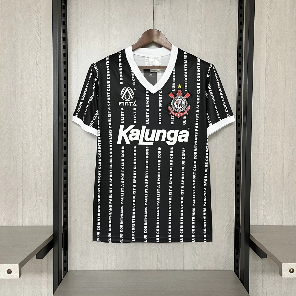 Essa é a camisa III retrô do Corinthians usada em 1994, esse modelo possui as cores predominantes Preto e Branco.