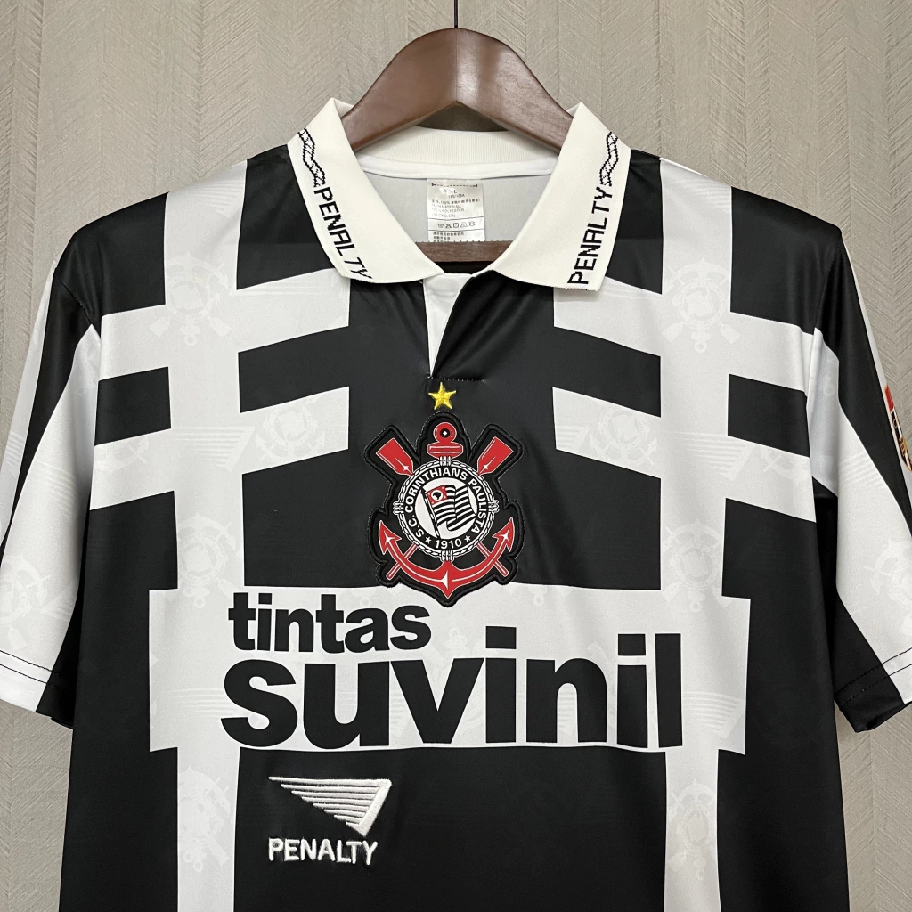Essa é a camisa III retrô do Corinthians usada usada entre os anos de 1995 e 1996, esse modelo possui as cores predominantes Preto e Branco.